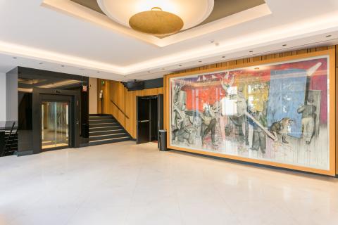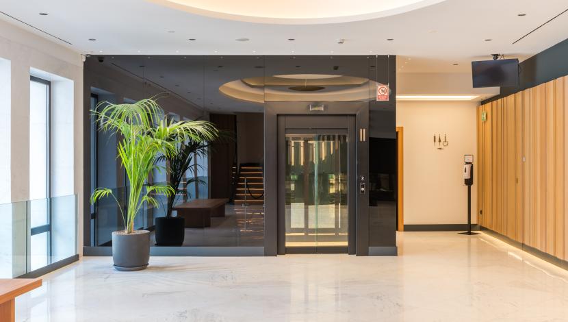 En este entorno, Orona ha incorporado un ascensor panorámico que se integra de forma armoniosa en el vestíbulo principal. La solución, con acabados en negro y vidrio, respeta la estética del edificio y aporta una presencia discreta y sofisticada. Su funcionamiento fluido facilita el tránsito del público y del personal, reforzando la accesibilidad sin alterar el carácter emblemático del teatro.