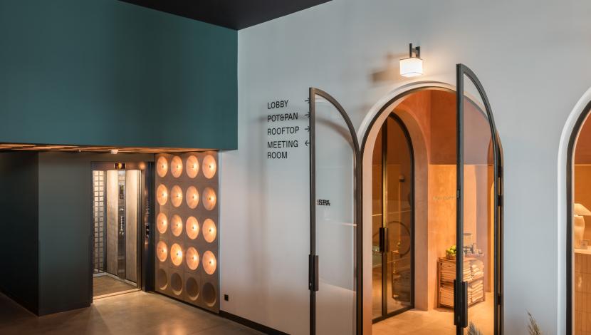 Os elevadores Orona integram-se neste diálogo arquitetónico com cabinas de estética sóbria e elegante, acabamentos metálicos e detalhes geométricos que reforçam a identidade do projeto. A iluminação pontual, os painéis em tons escuros e a execução precisa permitem que cada elevador acompanhe a experiência do hotel sem quebrar a harmonia do ambiente.