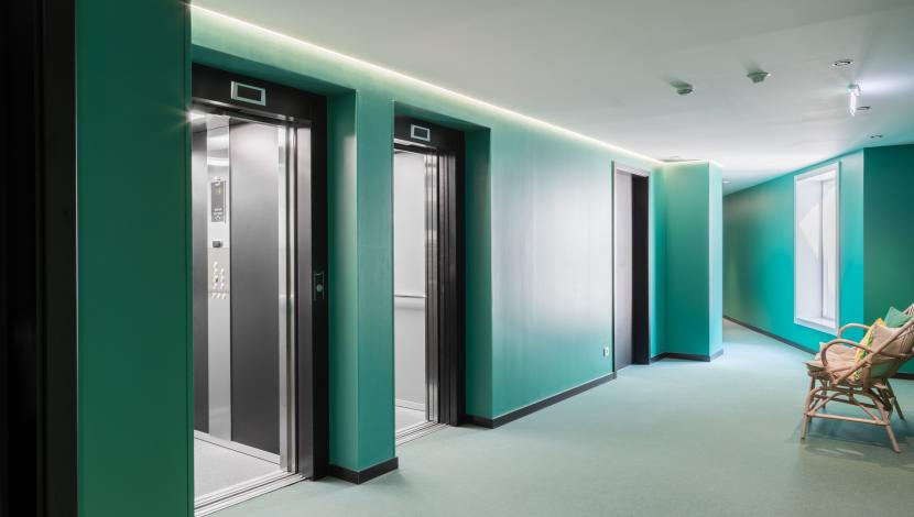Os elevadores Orona integram-se neste ambiente com uma estética moderna e sóbria, reforçada por tons neutros e linhas limpas que acompanham a arquitetura interior. As cabinas, iluminadas com um design uniforme e confortável, transmitem sensação de amplitude e qualidade, garantindo uma experiência fluida aos hóspedes em cada deslocação vertical.